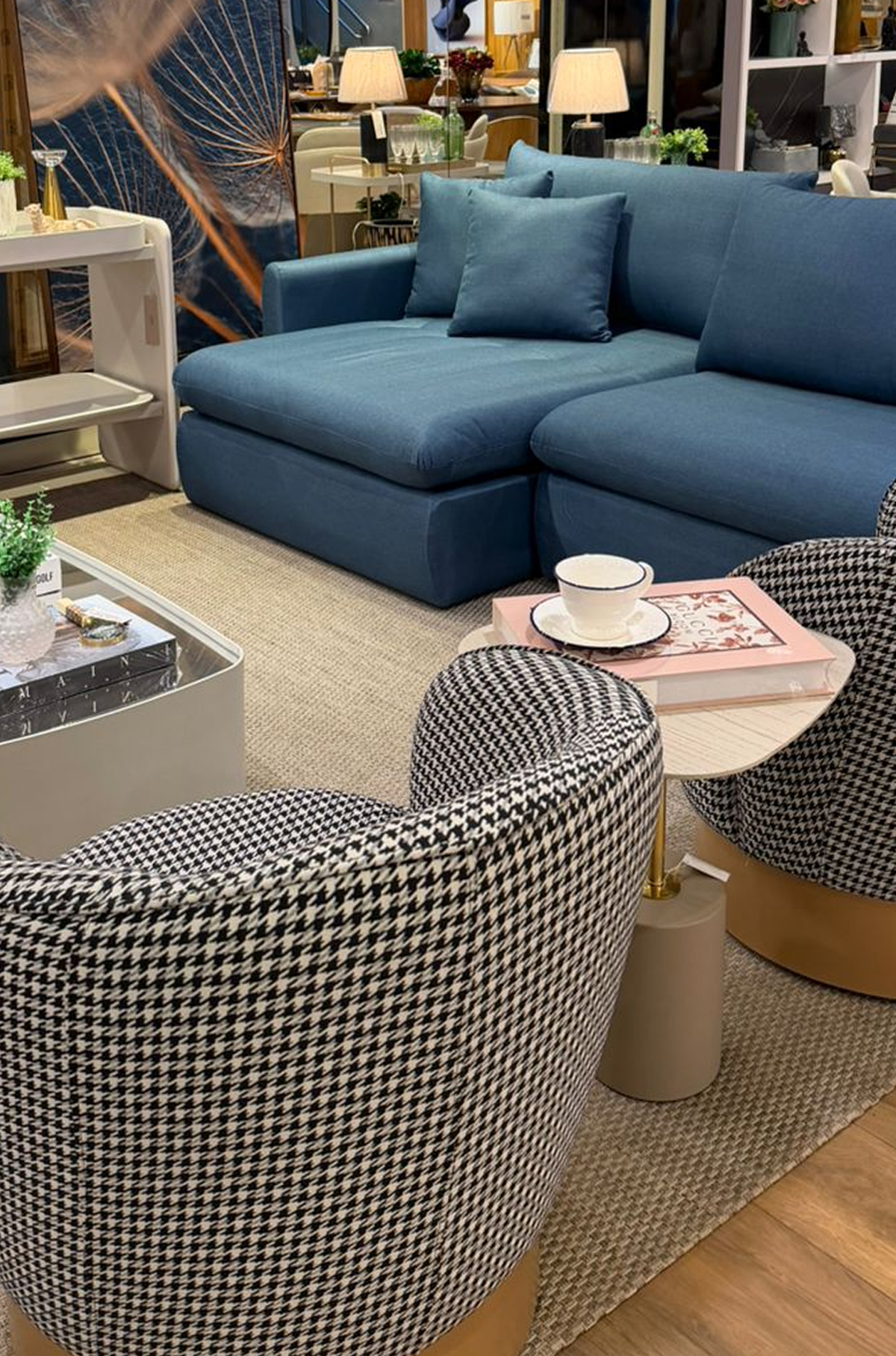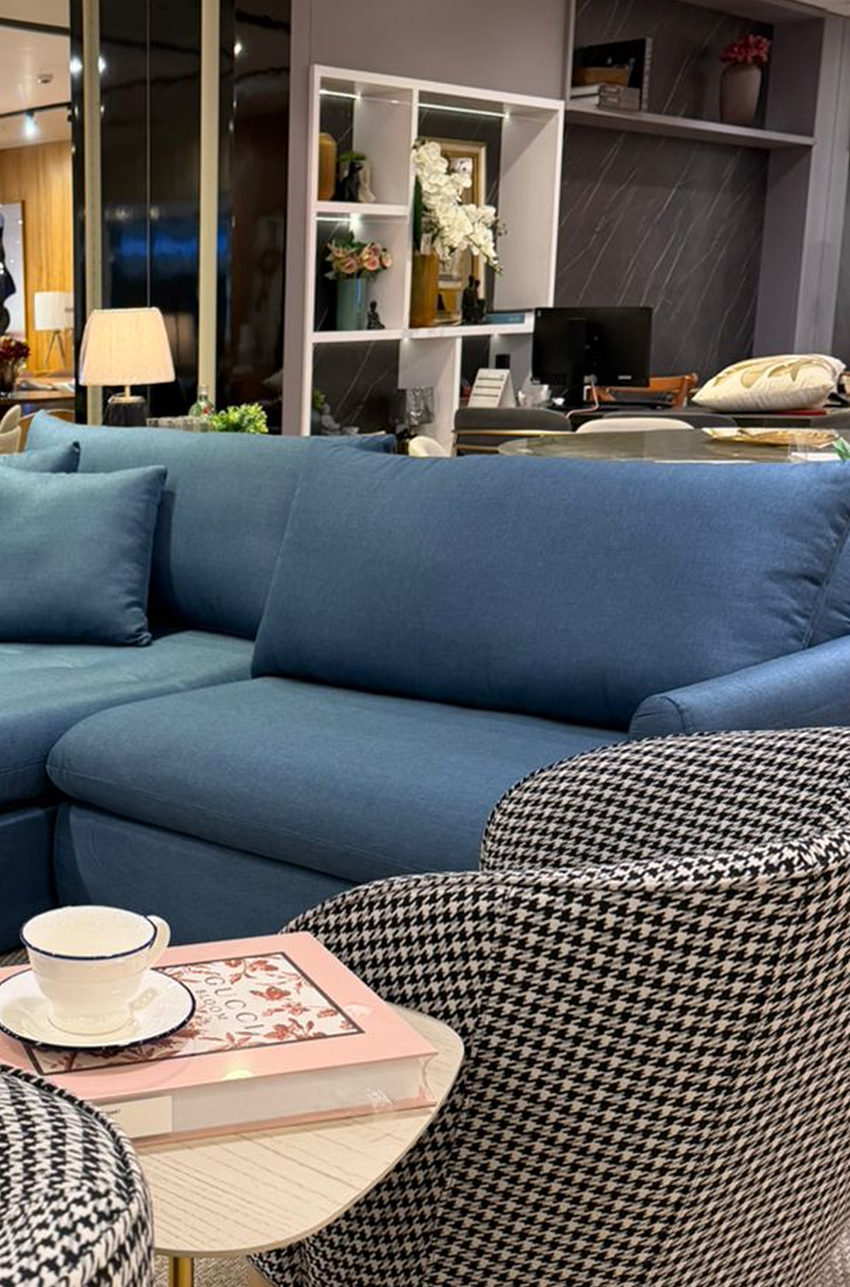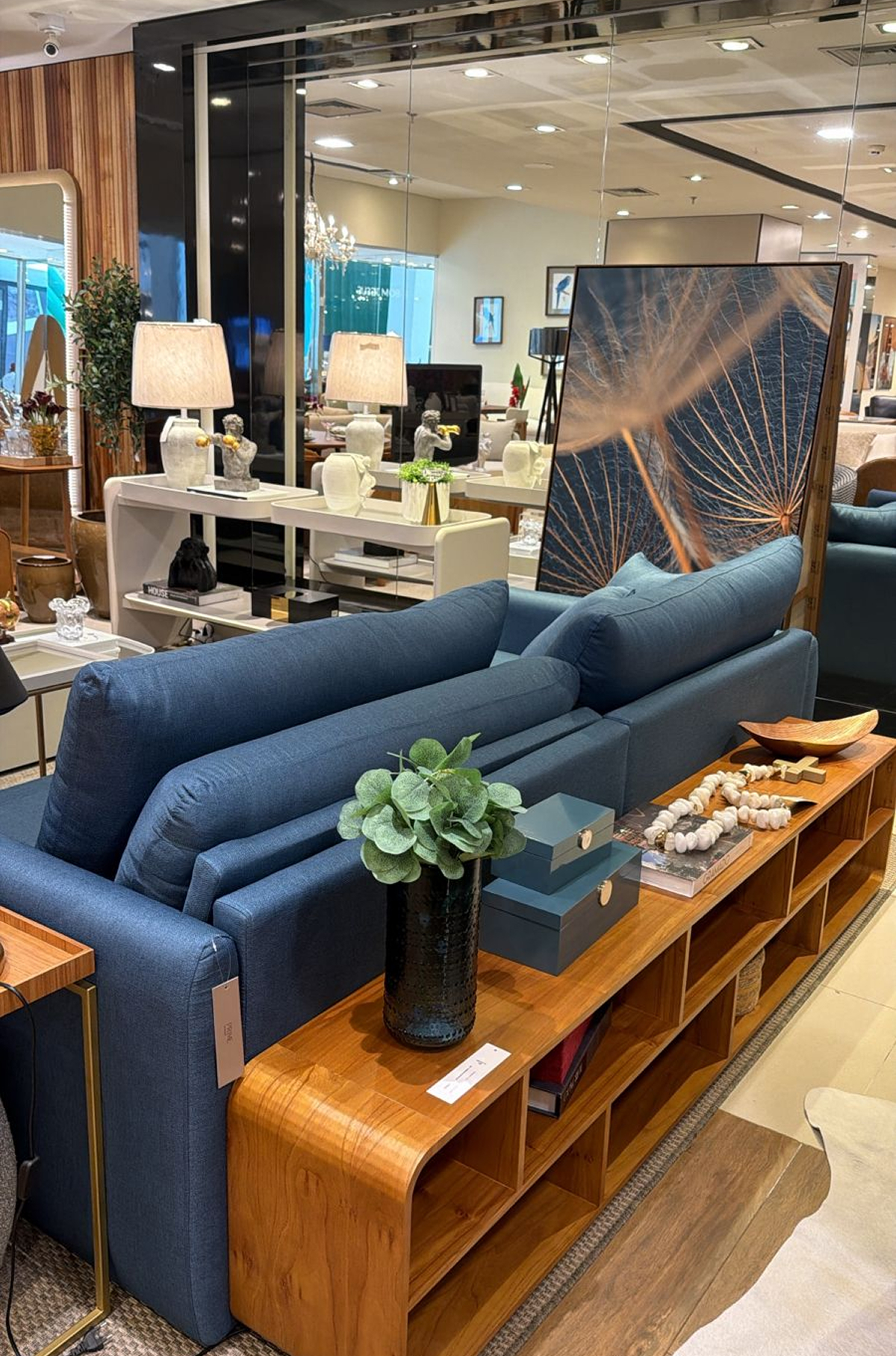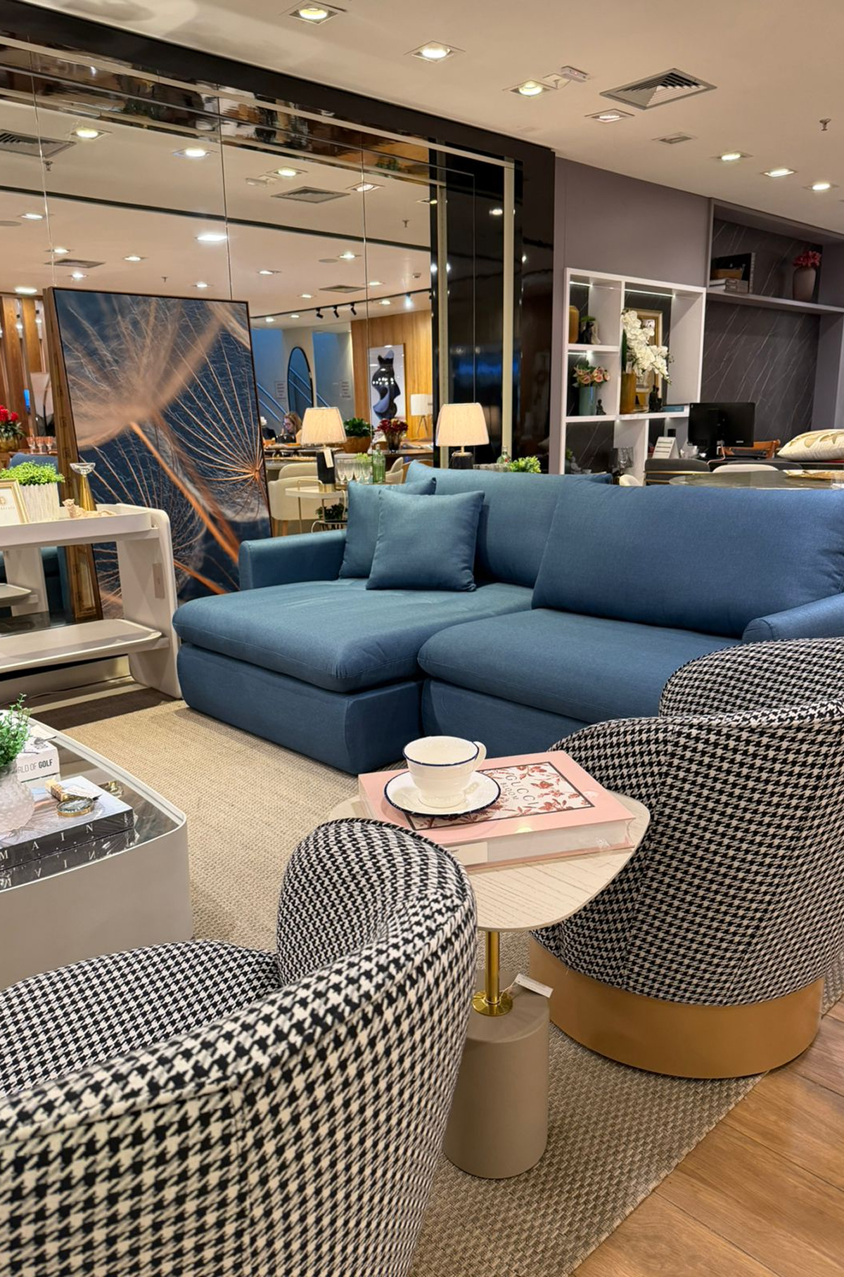 Um ambiente que equilibra sofisticação e conforto a partir da composição de tons neutros com o azul como destaque. A mistura de texturas e elementos amadeirados traz identidade e profundidade. E os detalhes decorativos garantem acolhimento. Um espaço pensado para receber e viver com elegância.
